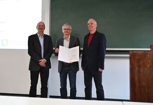 Andreas Engel hatte den Lehrstuhl für Statistische Physik an der Universität Oldenburg inne. Er blickt auf eine umfangreiche Erfahrung als Hochschullehrer zurück und wurde für hervorragende Lehre wiederholt von Studierenden ausgezeichnet. Im Rahmen der Seniorprofessur wird Andreas Engel (Mitte, gemeinsam mit Stiftungsgeschäftsführer Stefan Jorda und Institutsdirektor Niklas Nilius, v.l.) einen neuen Kurs über mathematische Methoden für Bachelorstudierende der Physik entwickeln und dazu ein Skript und Übungsaufgaben vorlegen. Der Kurs ist Teil einer grundlegenden Umgestaltung des Bachelorstudiengangs Physik in Oldenburg als Reaktion auf sinkende Anfängerzahlen und zu hohe Abbrecherquoten. (Foto: L. Englert, U Oldenburg)