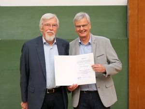 Am 21. April hat die Stiftung Prof. Dr. Jan Louis von der Universität Hamburg eine Wilhelm und Else Heraeus-Seniorprofessur verliehen. Jan Louis (rechts, gemeinsam mit Rolf-Dieter Heuer, Vorstandsmitglied der Stiftung) hat sich im Rahmen der Seniorprofessur zwei Projekte vorgenommen: die Gestaltung einer „School of Science“ in der Science City Hamburg Bahrenfeld sowie die Reform des Lehramtsstudiengangs Physik an der Universität Hamburg. Das Konzept der Science City Hamburg-Bahrenfeld, einer umfangreichen Erweiterung des bestehenden Forschungscampus aus Universität, DESY und weiteren Forschungsinstituten, sieht eine weiterführende Schule unter dem Arbeitstitel „School of Science“ vor. Jan Louis wird die Gestaltung dieser Schule mit Schwerpunkt auf den MINT-Fächern seitens der Universität vorantreiben. Darüber hinaus wird er sich angesichts der dringend notwendigen Verbesserung des Lehramtsstudiums dafür einsetzen, ein neues Konzept für den Kurs „Theoretische Physik“ sowie neue lehramtsspezifische Wahlfächer zu entwickeln. (Foto: UHH/MIN/Fuchs)