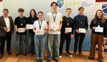 Emma Faßler (17) und Maxim Rasch (16, vorne Mitte) haben am 3. März das 11. German Young Physicists’ Tournament (GYPT) für sich entschieden: Sie…